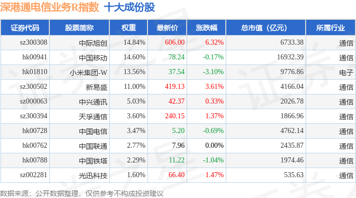 深港通电信业务R(483029)指数十大成份股详情如下: