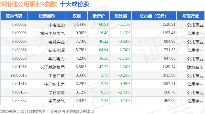 深港通公用事业R(483031)指数十大成份股详情如下: