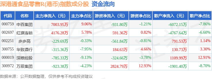 资金流向方面,深港通食品零售R(港币)(483038)指数成份股当日主力资金净流入合计8926.47万元,游资资金净流入合计1782.48万元,散户资金净流出合计1.07亿元。成份股资金流向详情见下表: