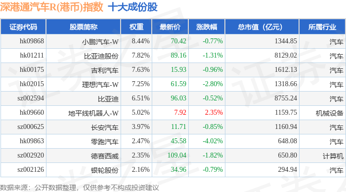 深港通汽车R(港币)(483040)指数十大成份股详情如下: