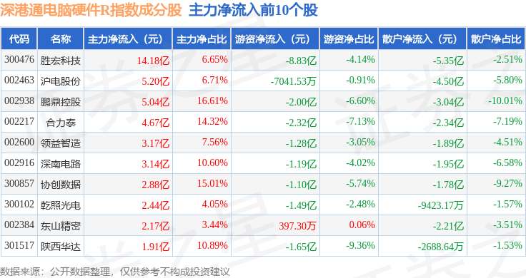 资金流向方面,深港通电脑硬件R(483043)指数成份股当日主力资金净流入合计6.27亿元,游资资金净流出合计14.85亿元,散户资金净流入合计8.58亿元。成份股资金流向详情见下表: