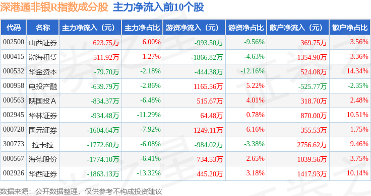 资金流向方面,深港通非银R(483053)指数成份股当日主力资金净流出合计12.72亿元,游资资金净流入合计2.26亿元,散户资金净流入合计10.45亿元。成份股资金流向详情见下表: