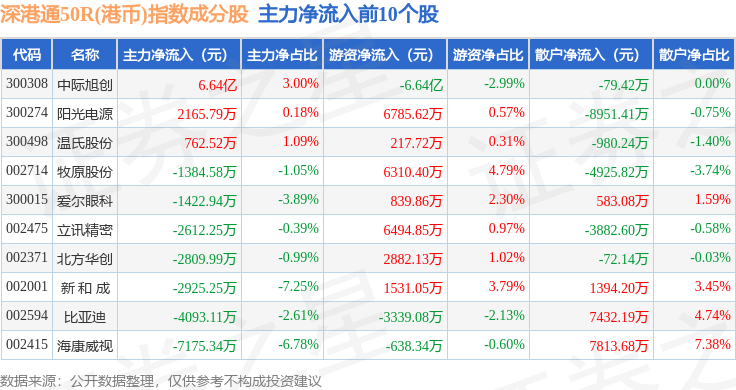 资金流向方面,深港通50R(港币)(483092)指数成份股当日主力资金净流出合计31.42亿元,游资资金净流入合计1.18亿元,散户资金净流入合计30.25亿元。成份股资金流向详情见下表: