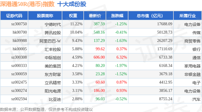深港通50R(港币)(483092)指数十大成份股详情如下: