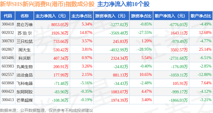 资金流向方面,新华SHS新兴消费R(港币)(489007)指数成份股当日主力资金净流出合计14.82亿元,游资资金净流入合计3.13亿元,散户资金净流入合计11.69亿元。成份股资金流向详情见下表: