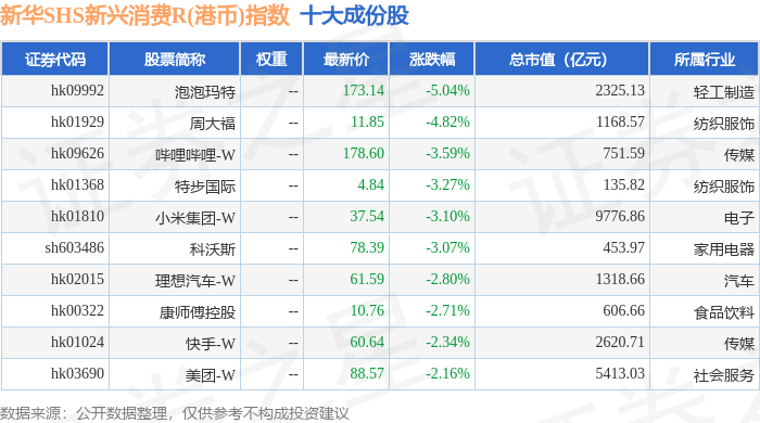 新华SHS新兴消费R(港币)(489007)指数十大成份股详情如下: