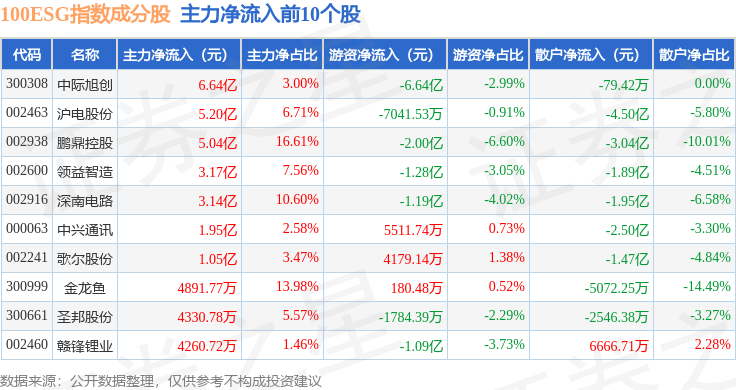 资金流向方面,100ESG(970027)指数成份股当日主力资金净流出合计43.38亿元,游资资金净流入合计5.73亿元,散户资金净流入合计37.65亿元。成份股资金流向详情见下表: