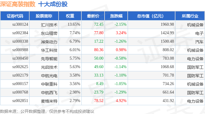 证券之星消息,12月9日,深证高装(970037)指数报收于2974.57点,跌0.39%,成交606.59亿元,换手率3.73%。当日该指数成份股中,上涨的有16家,麦格米特以4.92%的涨幅领涨,下跌的有34家,固高科技以5.93%的跌幅领跌。