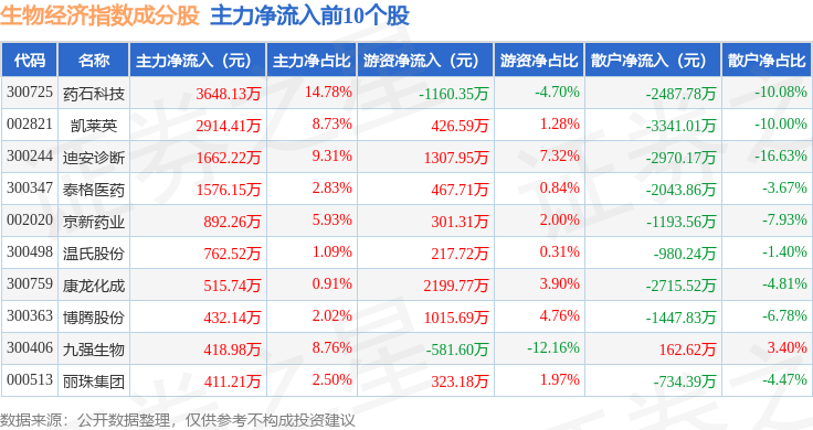 资金流向方面,生物经济(970038)指数成份股当日主力资金净流出合计6.32亿元,游资资金净流入合计3.79亿元,散户资金净流入合计2.53亿元。成份股资金流向详情见下表: