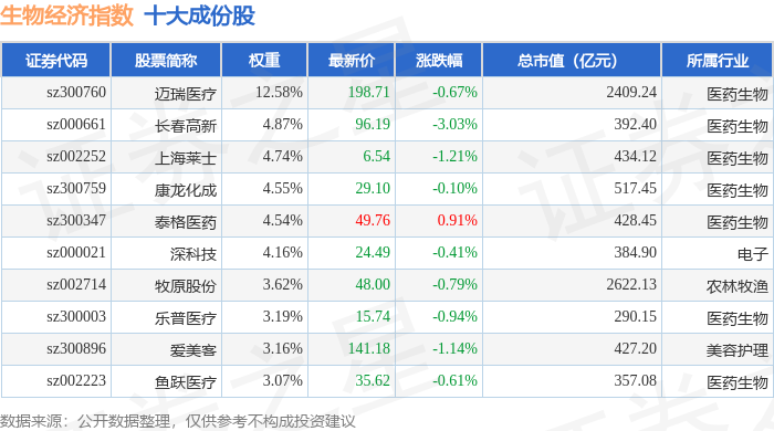 证券之星消息,12月9日,生物经济(970038)指数报收于2108.61点,跌0.95%,成交129.22亿元,换手率0.97%。当日该指数成份股中,上涨的有6家,药石科技以1.05%的涨幅领涨,下跌的有44家,派林生物以3.4%的跌幅领跌。
