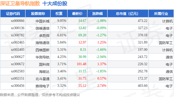 证券之星消息,12月9日,深证卫星导航(970050)指数报收于3548.99点,跌0.05%,成交454.63亿元,换手率7.26%。当日该指数成份股中,上涨的有17家,陕西华达以20.0%的涨幅领涨,下跌的有24家,天箭科技以5.88%的跌幅领跌。