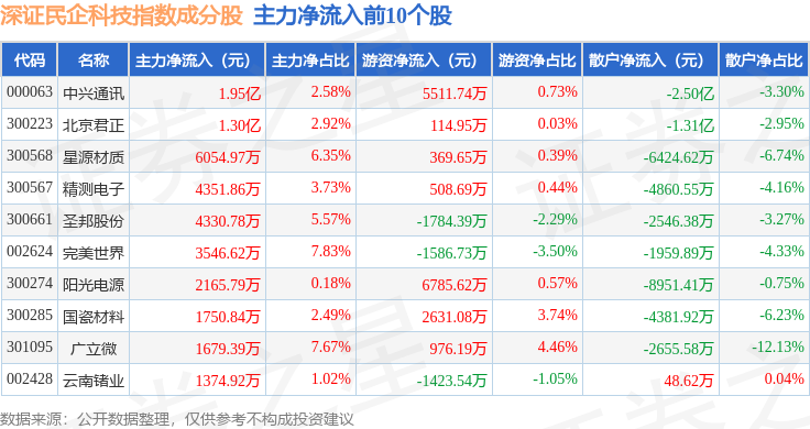资金流向方面,深证民企科技(970059)指数成份股当日主力资金净流出合计23.35亿元,游资资金净流入合计6.79亿元,散户资金净流入合计16.56亿元。成份股资金流向详情见下表: