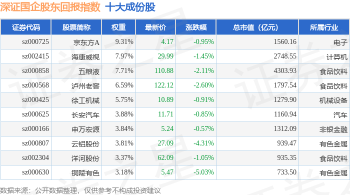 深证国企股东回报(970064)指数十大成份股详情如下: