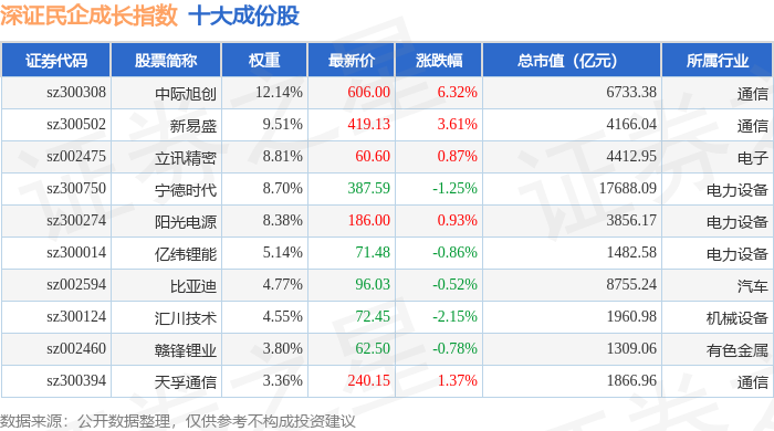证券之星消息,12月9日,深证民企成长(970071)指数报收于4057.89点,涨0.91%,成交1174.34亿元,换手率2.12%。当日该指数成份股中,上涨的有16家,中际旭创以6.32%的涨幅领涨,下跌的有34家,科达利以7.09%的跌幅领跌。
