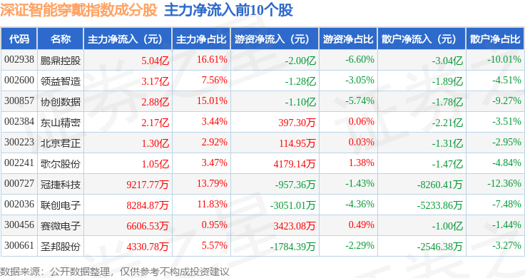 资金流向方面,深证智能穿戴(970074)指数成份股当日主力资金净流出合计4.02亿元,游资资金净流入合计2.25亿元,散户资金净流入合计1.77亿元。成份股资金流向详情见下表: