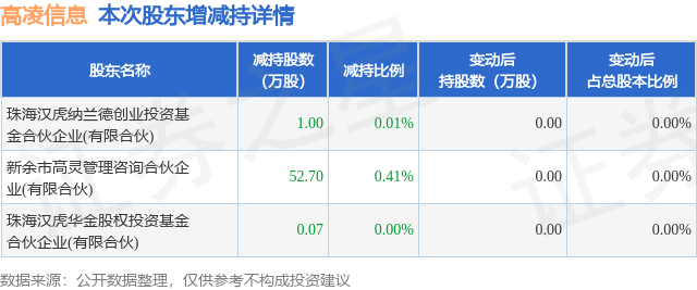 证券之星消息,12月9日高凌信息发布公告《高凌信息:特定股东减持股份结果公告》,其股东珠海汉虎纳兰德创业投资基金合伙企业(有限合伙)、新余市高灵管理咨询合伙企业(有限合伙)、珠海汉虎华金股权投资基金合伙企业(有限合伙)于2025年11月25日至2025年12月8日间合计减持53.77万股,占公司目前总股本的0.4157%,变动期间该股股价上涨5.99%,截止12月8日收盘报26.38元。