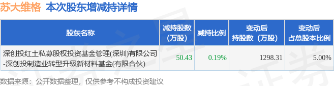 证券之星消息,12月9日苏大维格发布公告《苏大维格:简式权益变动报告书》,其股东深创投红土私募股权投资基金管理(深圳)有限公司-深创投制造业转型升级新材料基金(有限合伙)于2025年12月3日至2025年12月8日间合计减持50.43万股,占公司目前总股本的0.1942%,变动期间该股股价下跌0.61%,截止12月8日收盘报30.97元。