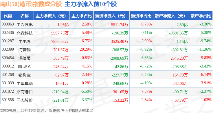 资金流向方面,南山50(港币)(980024)指数成份股当日主力资金净流出合计16.9亿元,游资资金净流入合计2.6亿元,散户资金净流入合计14.3亿元。成份股资金流向详情见下表: