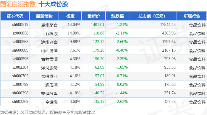 证券之星消息,12月9日,国证白酒(980031)指数报收于64454.24点,跌1.42%,成交150.99亿元,换手率0.6%。当日该指数成份股中,下跌的有26家,今世缘以2.63%的跌幅领跌。
