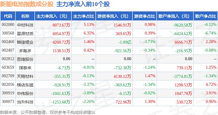 资金流向方面,新能电池(980032)指数成份股当日主力资金净流出合计29.92亿元,游资资金净流入合计5.73亿元,散户资金净流入合计23.61亿元。成份股资金流向详情见下表: