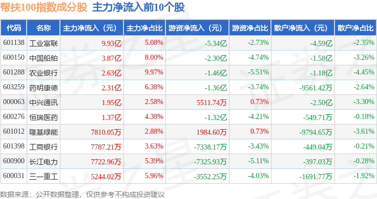 资金流向方面,帮扶100(980065)指数成份股当日主力资金净流出合计92.62亿元,游资资金净流入合计29.86亿元,散户资金净流入合计62.76亿元。成份股资金流向详情见下表:
