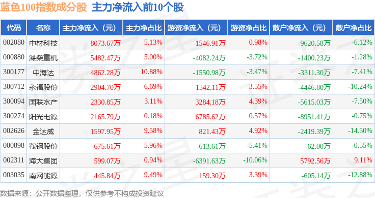 资金流向方面,蓝色100(980068)指数成份股当日主力资金净流出合计8.17亿元,游资资金净流出合计3489.49万元,散户资金净流入合计8.52亿元。成份股资金流向详情见下表: