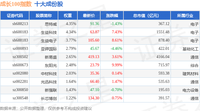 证券之星消息,12月9日,成长100(980080)指数报收于9739.93点,涨2.41%,成交1414.95亿元,换手率2.48%。当日该指数成份股中,上涨的有42家,鼎泰高科以14.8%的涨幅领涨,下跌的有57家,中富电路以7.09%的跌幅领跌。