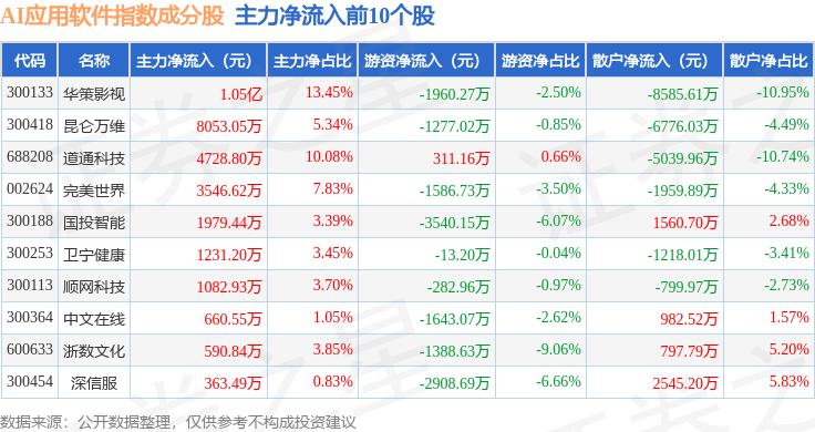 资金流向方面,AI应用软件(980107)指数成份股当日主力资金净流出合计24.28亿元,游资资金净流入合计4.74亿元,散户资金净流入合计19.54亿元。成份股资金流向详情见下表: