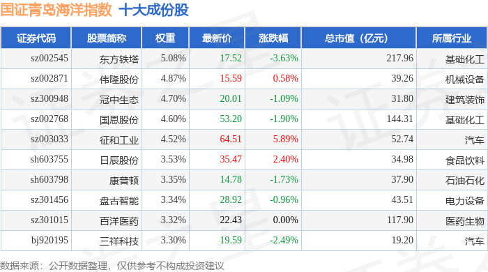 国证青岛海洋(980532)指数十大成份股详情如下: