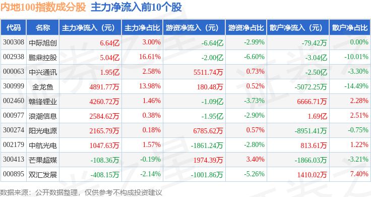 资金流向方面,内地100(983001)指数成份股当日主力资金净流出合计46.78亿元,游资资金净流入合计1.53亿元,散户资金净流入合计45.25亿元。成份股资金流向详情见下表: