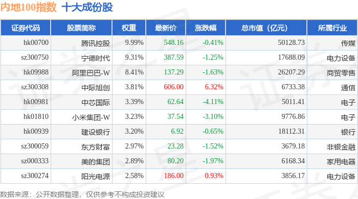 内地100(983001)指数十大成份股详情如下: