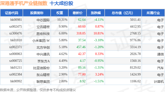 深港通手机产业链(983009)指数十大成份股详情如下: