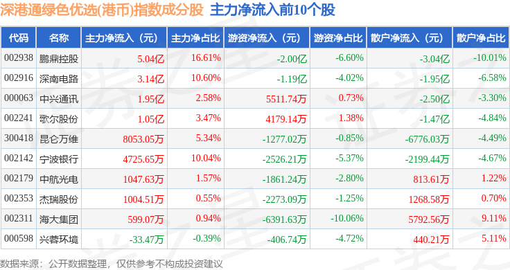资金流向方面,深港通绿色优选(港币)(983012)指数成份股当日主力资金净流出合计27.8亿元,游资资金净流入合计3.89亿元,散户资金净流入合计23.91亿元。成份股资金流向详情见下表: