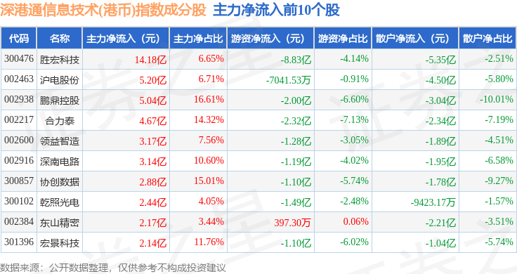 资金流向方面,深港通信息技术(港币)(983028)指数成份股当日主力资金净流出合计36.32亿元,游资资金净流出合计11.03亿元,散户资金净流入合计47.34亿元。成份股资金流向详情见下表: