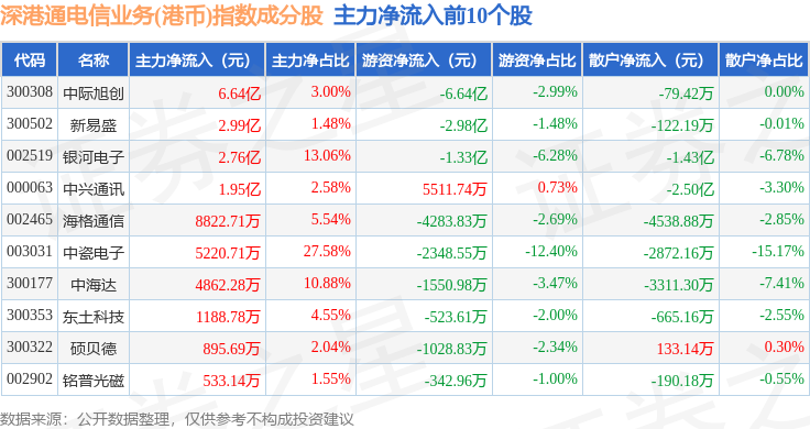 资金流向方面,深港通电信业务(港币)(983030)指数成份股当日主力资金净流出合计21.1亿元,游资资金净流出合计11.95亿元,散户资金净流入合计33.06亿元。成份股资金流向详情见下表: