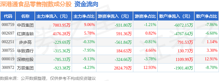 资金流向方面,深港通食品零售(983037)指数成份股当日主力资金净流入合计8926.47万元,游资资金净流入合计1782.48万元,散户资金净流出合计1.07亿元。成份股资金流向详情见下表: