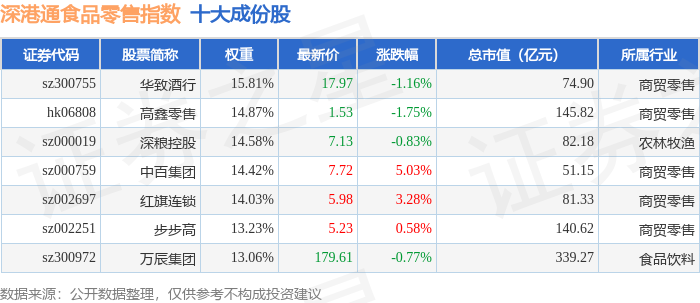 证券之星消息,12月9日,深港通食品零售(983037)指数报收于2338.04点,涨0.61%,成交25.46亿元,换手率2.6%。当日该指数成份股中,上涨的有3家,中百集团以5.03%的涨幅领涨,下跌的有4家,高鑫零售以1.75%的跌幅领跌。