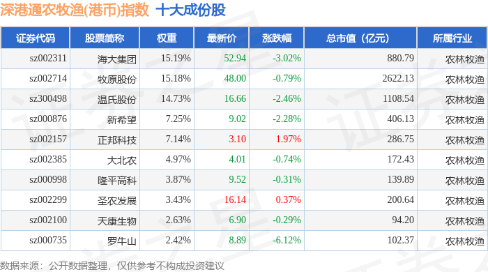 深港通农牧渔(港币)(983052)指数十大成份股详情如下: