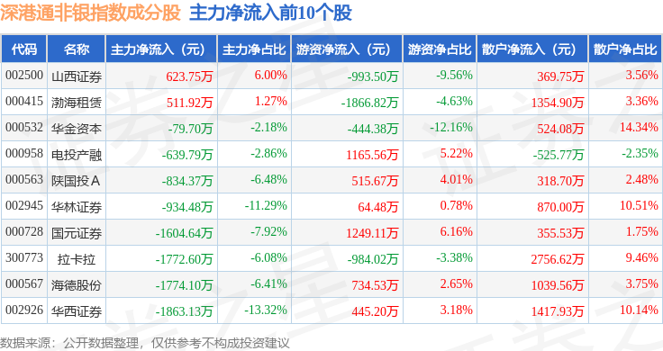 资金流向方面,深港通非银(983053)指数成份股当日主力资金净流出合计12.72亿元,游资资金净流入合计2.26亿元,散户资金净流入合计10.45亿元。成份股资金流向详情见下表: