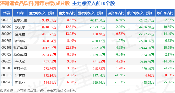 资金流向方面,深港通食品饮料(港币)(983066)指数成份股当日主力资金净流出合计7.66亿元,游资资金净流入合计1.09亿元,散户资金净流入合计6.58亿元。成份股资金流向详情见下表: