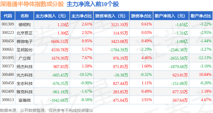 资金流向方面,深港通半导体(983067)指数成份股当日主力资金净流出合计4.49亿元,游资资金净流入合计2.53亿元,散户资金净流入合计1.97亿元。成份股资金流向详情见下表: