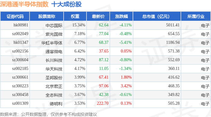 证券之星消息,12月9日,深港通半导体(983067)指数报收于14040.85点,跌1.18%,成交397.1亿元,换手率2.9%。当日该指数成份股中,上涨的有11家,北京君正以3.42%的涨幅领涨,下跌的有28家,华虹半导体以5.41%的跌幅领跌。