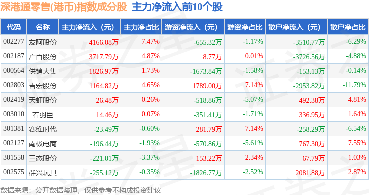资金流向方面,深港通零售(港币)(983074)指数成份股当日主力资金净流出合计2403.68万元,游资资金净流入合计233.74万元,散户资金净流入合计2169.94万元。成份股资金流向详情见下表: