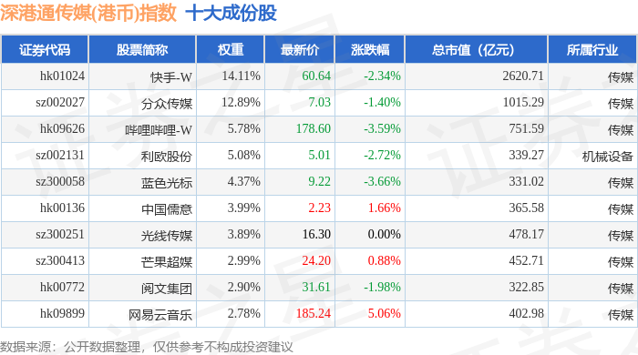 深港通传媒(港币)(983076)指数十大成份股详情如下: