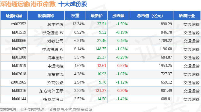 深港通运输(港币)(983078)指数十大成份股详情如下: