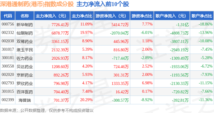 资金流向方面,深港通制药(港币)(983080)指数成份股当日主力资金净流出合计12.11亿元,游资资金净流入合计2.17亿元,散户资金净流入合计9.94亿元。成份股资金流向详情见下表: