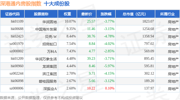 证券之星消息,12月9日,深港通内房股(983083)指数报收于715.04点,跌3.26%,成交114.48亿元,换手率1.44%。当日该指数成份股中,上涨的有6家,中国武夷以4.63%的涨幅领涨,下跌的有44家,中国金茂以14.6%的跌幅领跌。