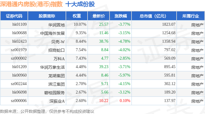 深港通内房股(港币)(983084)指数十大成份股详情如下: