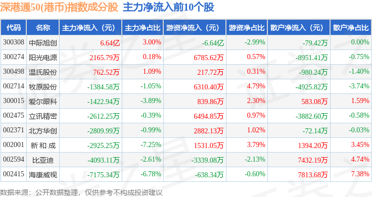 资金流向方面,深港通50(港币)(983092)指数成份股当日主力资金净流出合计31.42亿元,游资资金净流入合计1.18亿元,散户资金净流入合计30.25亿元。成份股资金流向详情见下表: