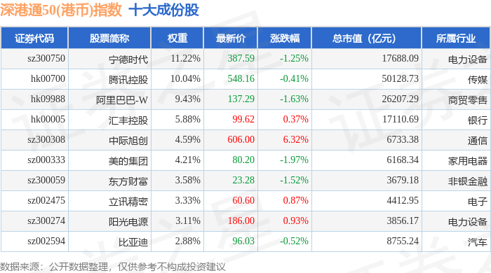 深港通50(港币)(983092)指数十大成份股详情如下: